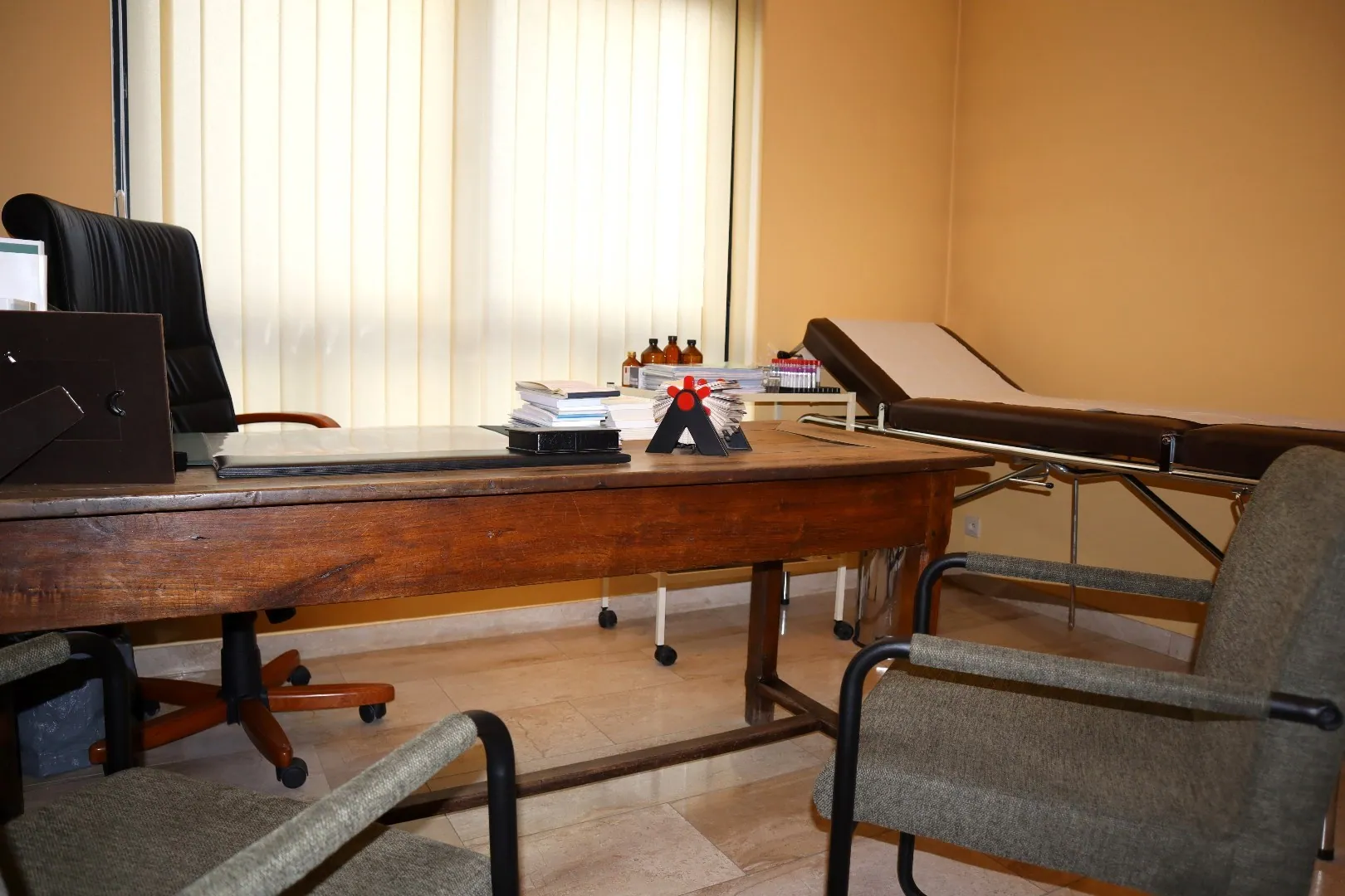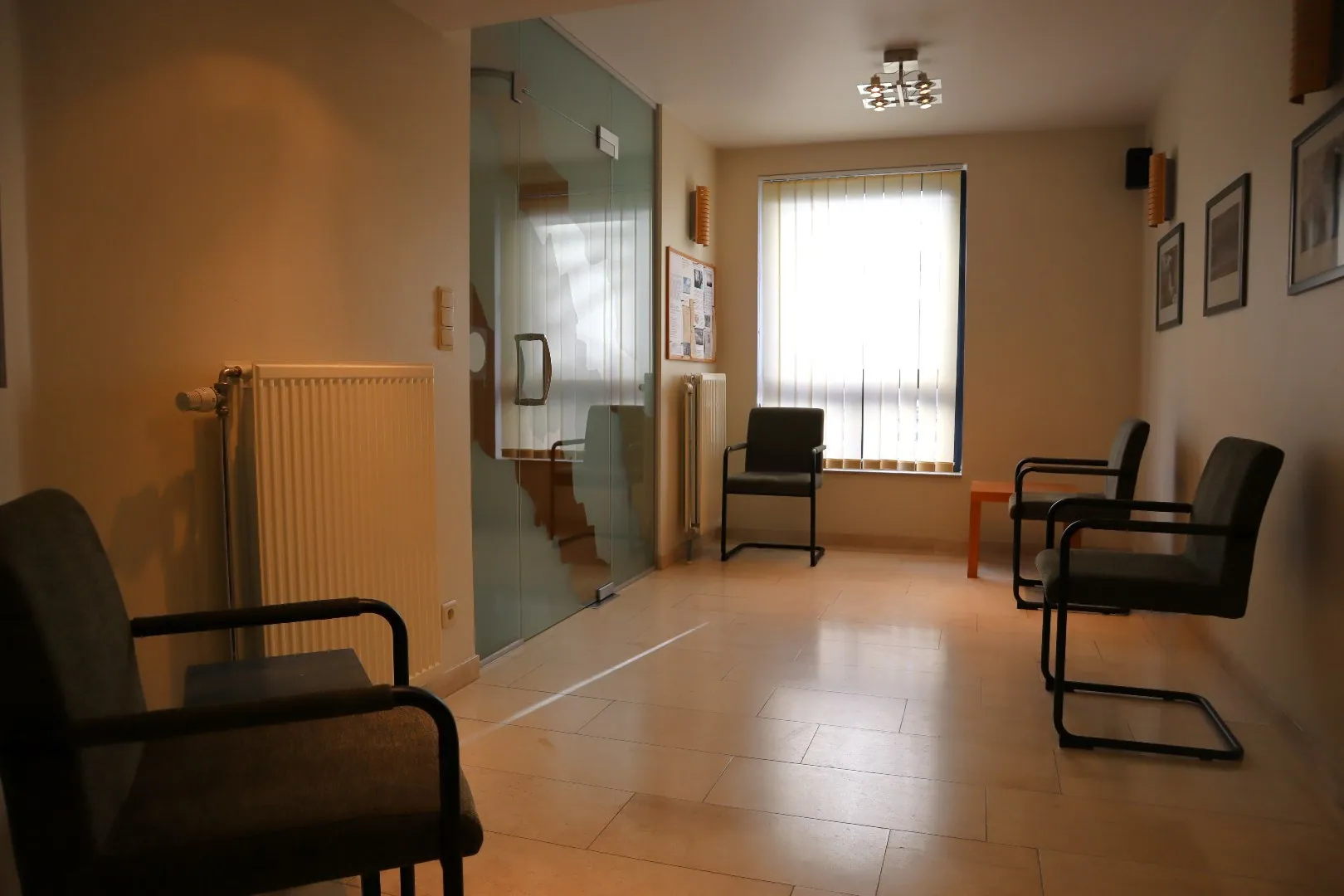 De ruimte omvat: hall en toilet, wachtzaal, onthaal/secretariaat, kitchenette, berging/archief, toilet, polyvalente ruimte, praktijkruimte zelf.