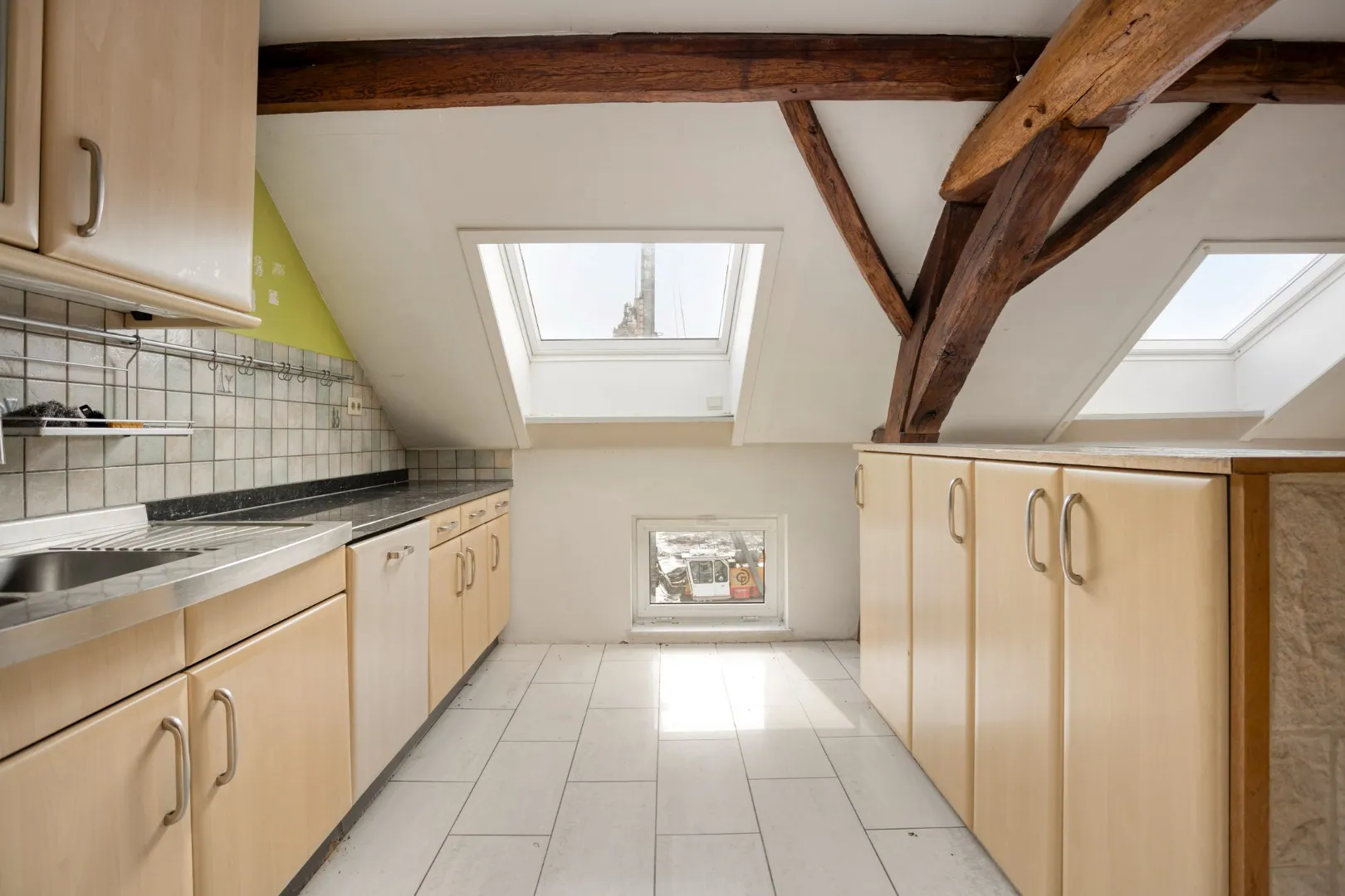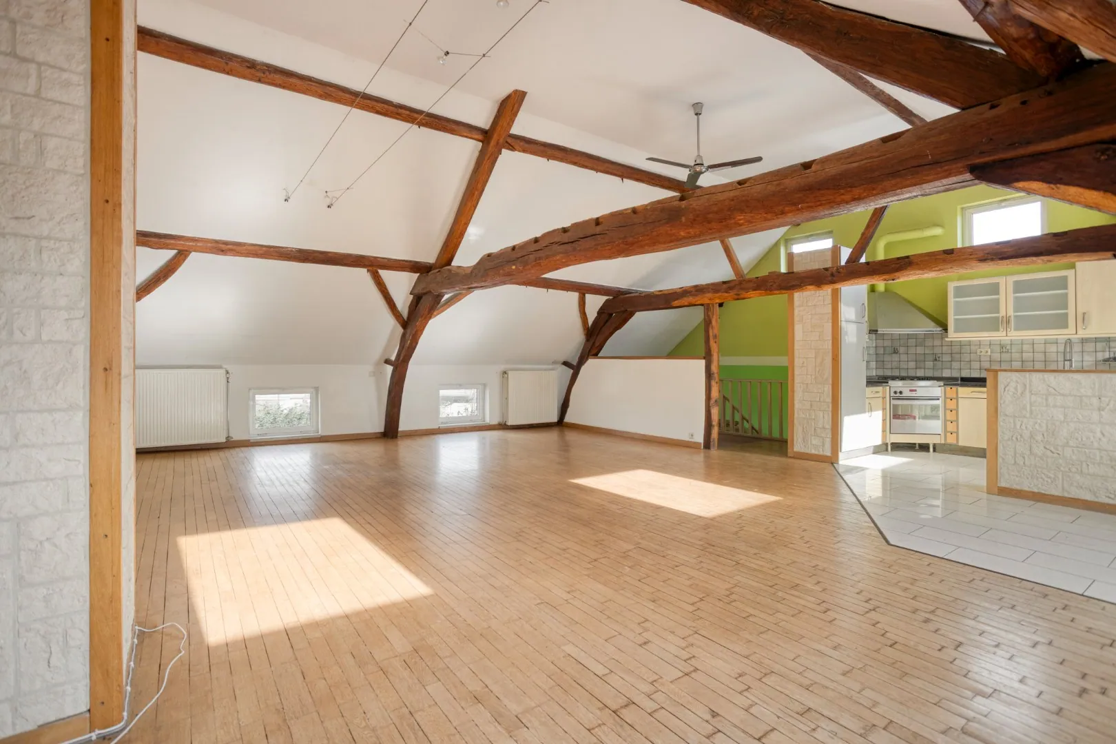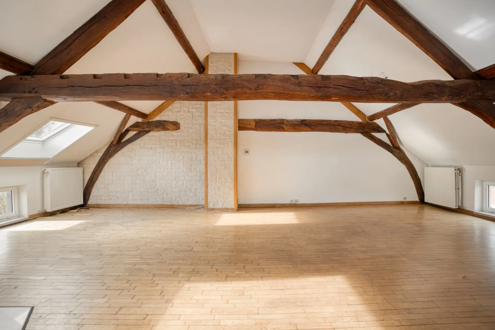 Op de 2de verdieping heeft u een zeer ruimte leefruimte van 57m² met authentieke materialen (mooi houtgebinte). De open keuken is volledig uitgerust wat super fijn is om te koken.