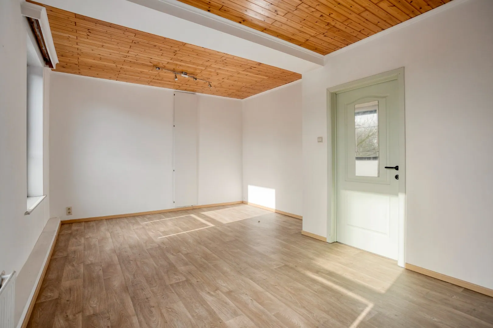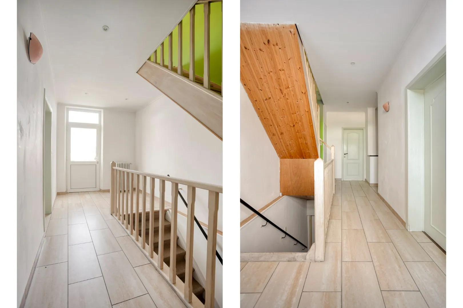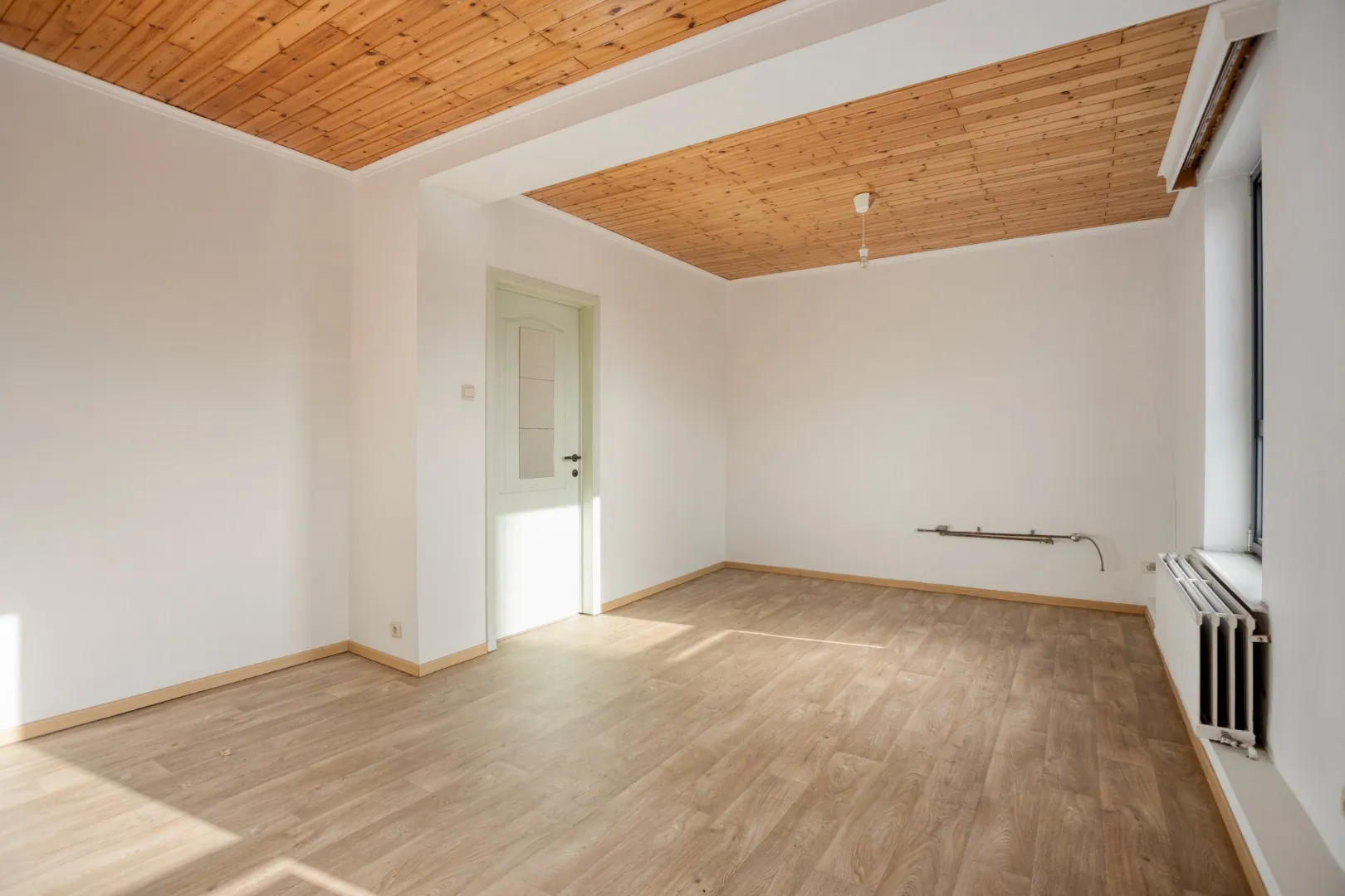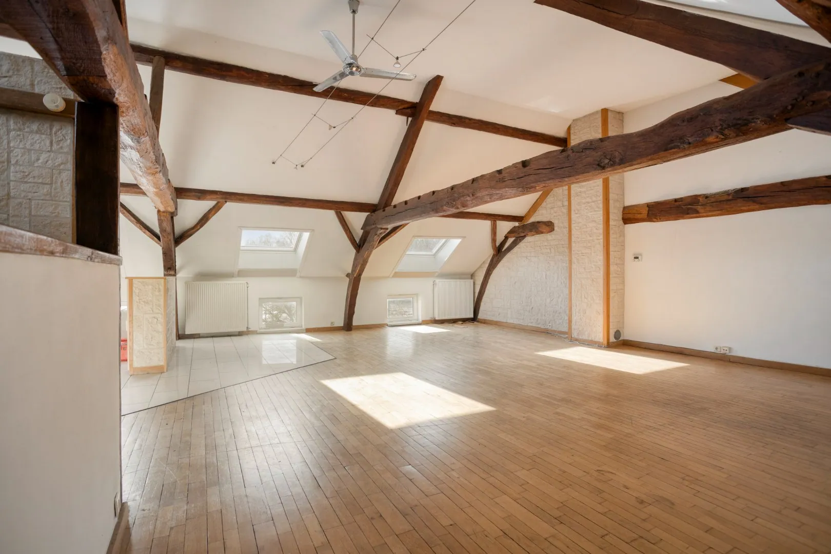 Op de 2de verdieping heeft u een zeer ruimte leefruimte van 57m² met authentieke materialen (mooi houtgebinte). De open keuken is volledig uitgerust wat super fijn is om te koken.