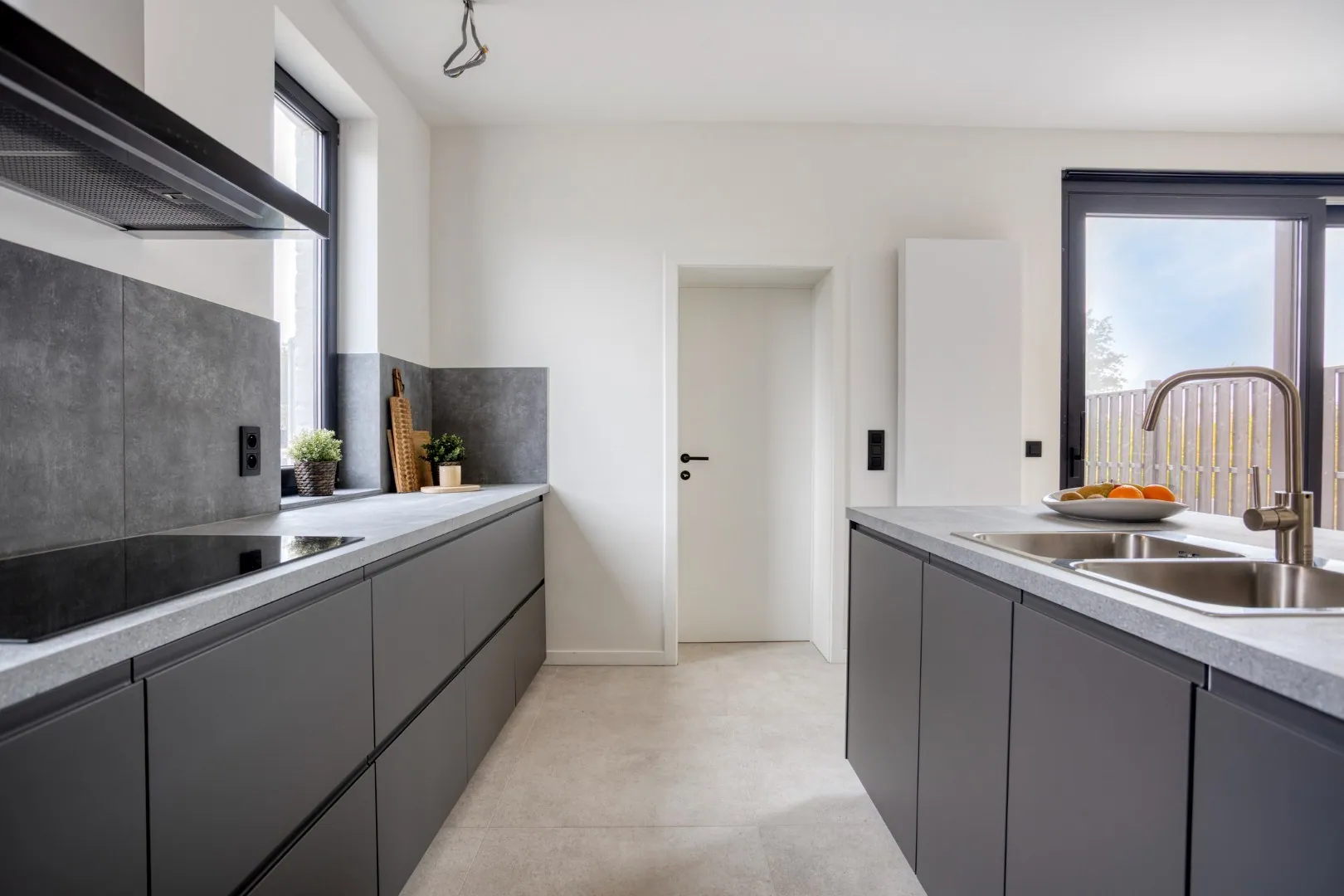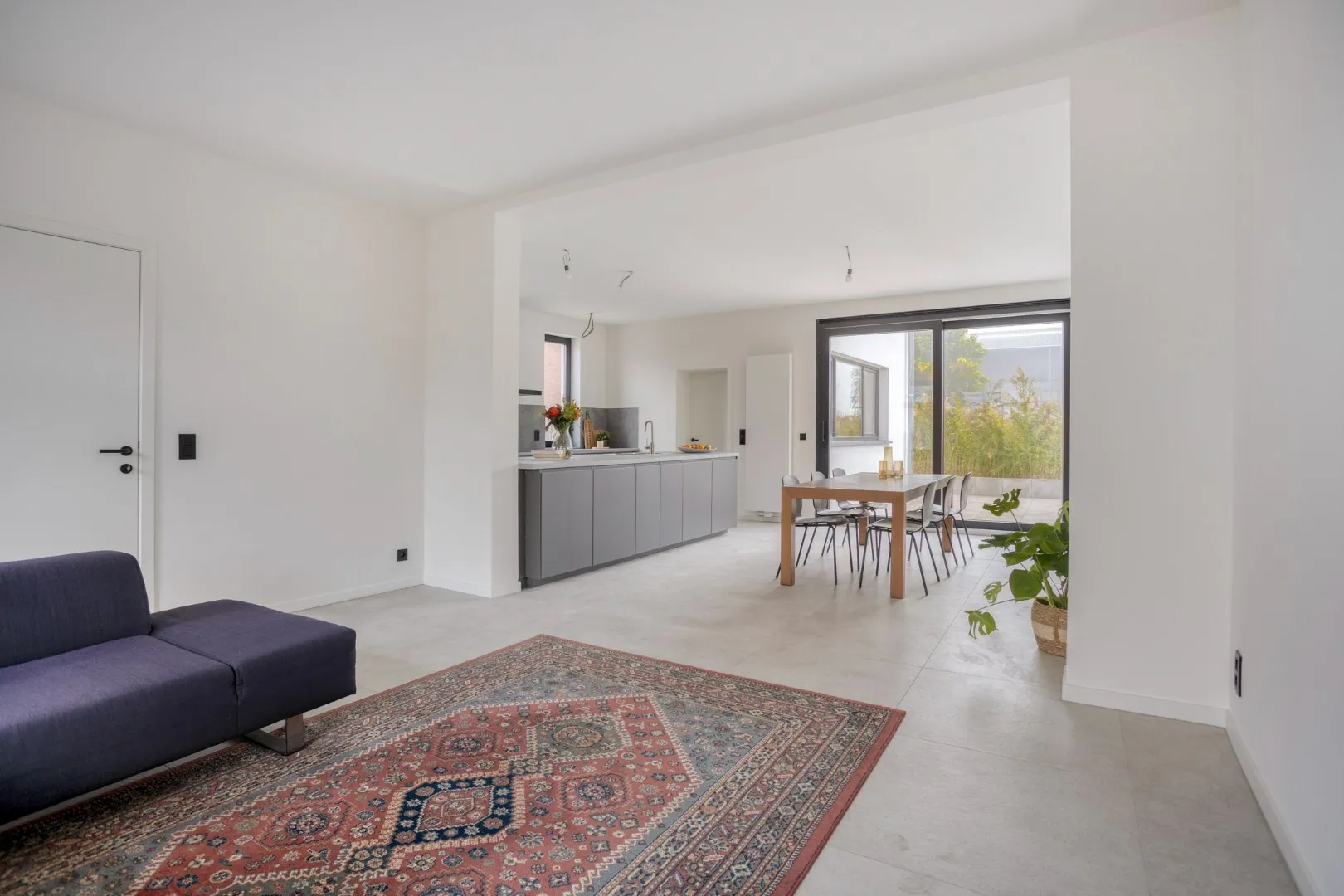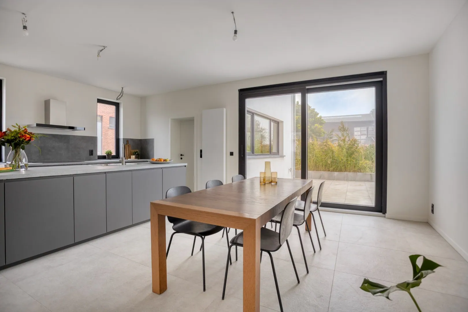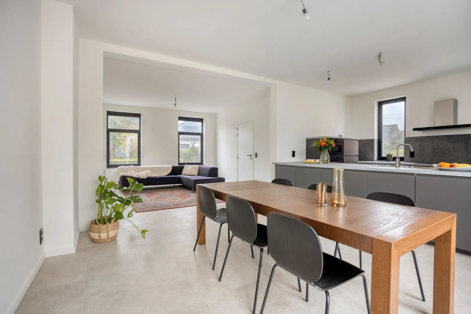 De lichtrijke leefruimte met open, volledig ingerichte keuken vormt het hart van de woning. De grote raampartijen bieden een rechtstreeks zicht op de zuidgerichte tuin.